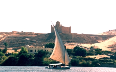 The stylized image of a Felucca in front of the Aga Khan Tomb in Aswan.