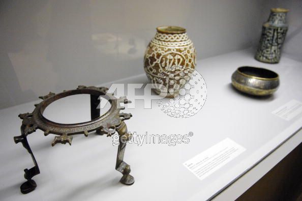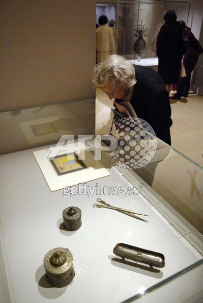 An astrolabe (Spain, 14th century) is presented in the exhibition The Song of the World, 02 October 2007 at the Musee du Louvre in Paris. The exhibition, which takes place from 05 October until 07 January 2008, outlines the evolution of art in Iran under the Safavid Dynasty (1501?1736) presenting a selection of masterpieces from the Aga Khan collection of Islamic art, as a preview to the opening of the Aga Khan Museum in Toronto. AFP PHOTO STEPHANE DE SAKUTINTwo pages with the integral version of the Coran (India, 13th century) is presented in the exhibition The Song of the World, 02 October 2007 at the Musee du Louvre in Paris. The exhibition, which takes place from 05 October until 07 January 2008, outlines the evolution of art in Iran under the Safavid Dynasty (1501?1736) presenting a selection of masterpieces from the Aga Khan collection of Islamic art, as a preview to the opening of the Aga Khan Museum in Toronto. AFP PHOTO STEPHANE DE SAKUTINA tripod (L) (Iran, end of the 12th century-begining of the 13th) is presented in the exhibition The Song of the World, 02 October 2007 at the Musee du Louvre in Paris. The exhibition, which takes place from 05 October until 07 January 2008, outlines the evolution of art in Iran under the Safavid Dynasty (1501?1736) presenting a selection of masterpieces from the Aga Khan collection of Islamic art, as a preview to the opening of the Aga Khan Museum in Toronto. AFP PHOTO STEPHANE DE SAKUTINA calligraphy drawing featuring a lion (17th century, India) is presented in the exhibition The Song of the World, 02 October 2007 at the Musee du Louvre in Paris. The exhibition, which takes place from 05 October until 07 January 2008, outlines the evolution of art in Iran under the Safavid Dynasty (1501?1736) presenting a selection of masterpieces from the Aga Khan collection of Islamic art, as a preview to the opening of the Aga Khan Museum in Toronto. AFP PHOTO STEPHANE DE SAKUTINA woman looks at two jugs with shields (Syria, 15th century), presented in the exhibition The Song of the World, 02 October 2007 at the Musee du Louvre in Paris. The exhibition, which takes place from 05 October until 07 January 2008, outlines the evolution of art in Iran under the Safavid Dynasty (1501?1736) presenting a selection of masterpieces from the Aga Khan collection of Islamic art, as a preview to the opening of the Aga Khan Museum in Toronto. AFP PHOTO STEPHANE DE SAKUTINA woman looks at a drawing presented in the exhibition The Song of the World, 02 October 2007 at the Musee du Louvre in Paris. The exhibition, which takes place from 05 October until 07 January 2008, outlines the evolution of art in Iran under the Safavid Dynasty (1501?1736) presenting a selection of masterpieces from the Aga Khan collection of Islamic art, as a preview to the opening of the Aga Khan Museum in Toronto. AFP PHOTO STEPHANE DE SAKUTINA tablet called the Kaba (Turkey, 17th century) is presented in the exhibition The Song of the World, 02 October 2007 at the Musee du Louvre in Paris. The exhibition, which takes place from 05 October until 07 January 2008, outlines the evolution of art in Iran under the Safavid Dynasty (1501?1736) presenting a selection of masterpieces from the Aga Khan collection of Islamic art, as a preview to the opening of the Aga Khan Museum in Toronto. AFP PHOTO STEPHANE DE SAKUTINTwo paintings featuring young stylish people (Iran, end of the 18th century) are presented in the exhibition The Song of the World, 02 October 2007 at the Musee du Louvre in Paris. The exhibition, which takes place from 05 October until 07 January 2008, outlines the evolution of art in Iran under the Safavid Dynasty (1501?1736) presenting a selection of masterpieces from the Aga Khan collection of Islamic art, as a preview to the opening of the Aga Khan Museum in Toronto. AFP PHOTO STEPHANE DE SAKUTIN