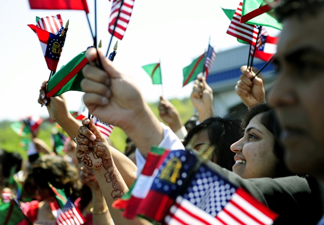 Sannah Vasaya, 18, from Snellville waves flags with other members of the Ismaili community.