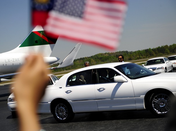 The Aga Khan, head of the world’s 15 million Ismaili Muslims, arrives at Fulton County Airport on Thursday.