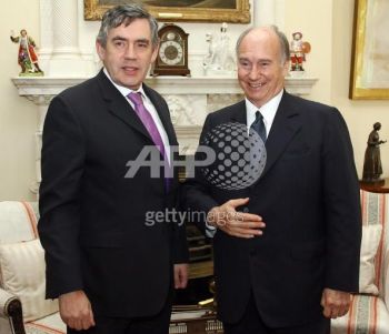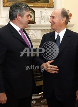 British Prime Minister Gordon Brown (L) meets the Aga Khan, who is visiting the United Kingdom to mark the fiftieth anniversary of becoming the Imam of the Shia Ismaili community, at 10 Downing Street, in London, on July 3, 2008. The Aga Khan is expected to attend a dinner hosted by Britain’s Queen Elizabeth II during his visit. Leon Neal/AFP/Getty Images