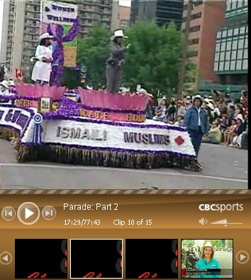 On the right, there are 15 clips. Scroll right to thumbnail #10 (called Parade: Part 2). Play the video and forward to 16 minutes and 35 seconds to see the Ismaili Muslims Float.