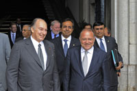 AKDN – 11 July 2008 – On the second day of his visit to Portugal, His Highness the Aga Khan held meetings with various government officials, including the Minister of Justice, Alberto Costa, as well as the President of the Assembly of the Republic Jaime Gama. Later that day, the Aga Khan held a meeting with Foreign Minister, Luis Amado and then met with Prime Minister Jose Socrates at the Prime Minister’s Palace. Here, the Aga Khan and the Foreign Minister signed an Agreement of International Cooperation between the Ismaili Imamat and the Ministry of Foreign Affairs of the Portuguese Republic. Photo Credit: Gary Otte / AKDN