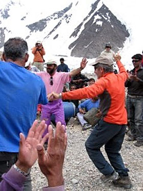 Saturday was party time in all Karakoram BCs; the porters celebrated Aga Khan’s birthday [Imamat Day] by dancing and singing around bonfires.