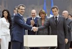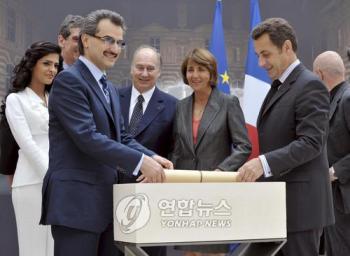 Saudi Arabian Prince Alwaleed bin Talal Bin Abdul aziz Al Saud, front left, and French president Nicolas Sarkozy, front right, places a map of the Louvre museum's future Islamic art department inside its first stone on Wednesday, July 16, 2008 in Paris, during a ceremony marking the launch of the works. In the background, from left to right, Prince Alwaleed bin Talal's wife, Princess Ameera, Spiritual leader of the Shia Imami Ismaili Muslims the Aga Khan and French Culture minister Christine Albanel. AP Photo/ Ecric Feferberg, Pool