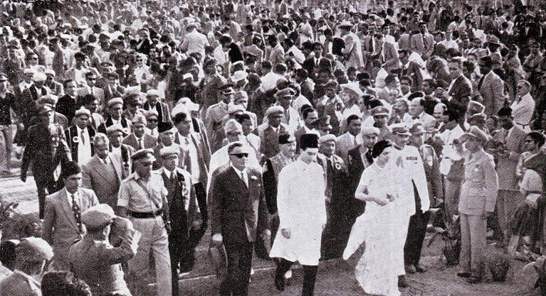 Prince Karim Aga Khan arrives in Karachi for his enthronement ceremony on 23 January 1958 escorted by President Iskander Mirza and Mrs Naheed Mirza