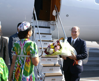 Dushanbe, October 31. His Highness Prince Aga Khan IV, arrived in Dushanbe. In the capital airport, he met with Deputy Prime Minister Asadullo Gulomov and Minister of Foreign Affairs of the Republic of Tajikistan Hamrohon Zarifi. The visit of His Highness the Aga Khan IV is at the invitation of the Government of the Republic of Tajikistan and organized on the occasion of his Golden Jubilee as Imam of the Ismaili Muslims.