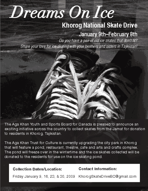 The Aga Khan Youth and Sports Board for Canada is pleased to announce the launch of a National Ice Skate Drive from January 9th to February 8th, 2009.