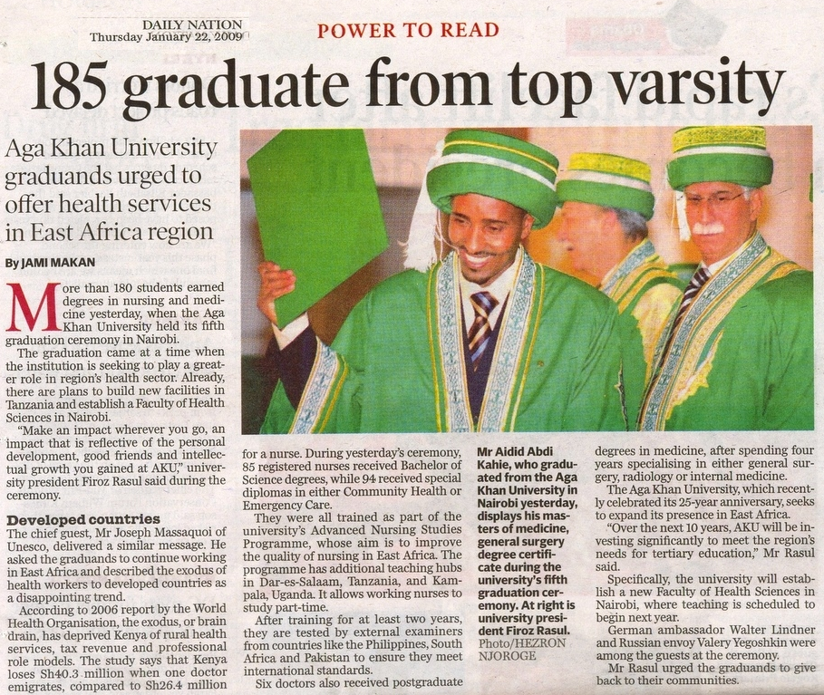 Aga Khan University in East Africa held two graduation ceremonies in Kenya and Uganda, where it has programmes in the fields of medicine, nursing and education.