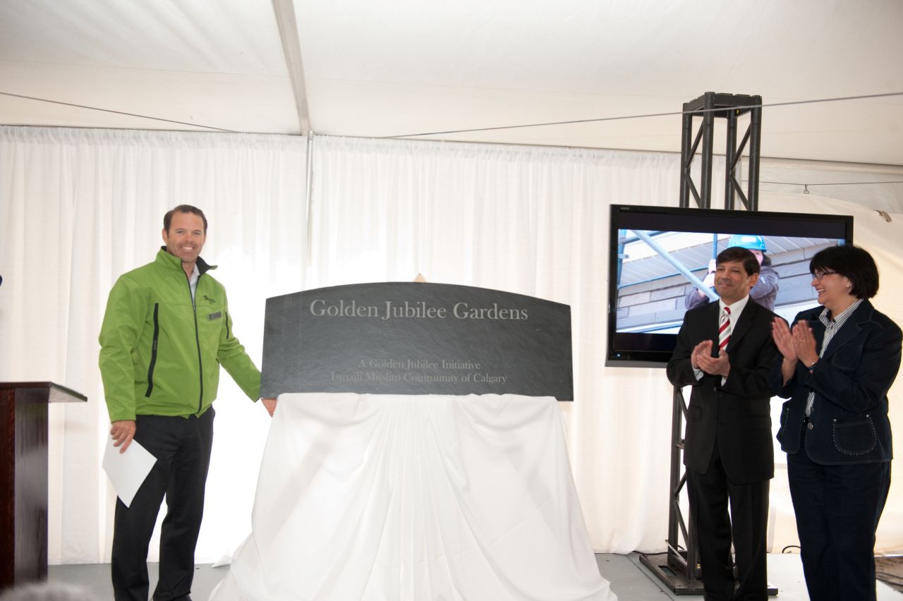 Yvonne Fritz, Minister for Housing and Urban Affairs for the Government of Alberta, Ismaili Council for the Prairies President Nashir Samanani, and Habitat for Humanity Calgary President & CEO, Andrew MacLachlan, unveil the entrance slate and the name of the development, Golden Jubilee Gardens, as chosen by the Jamat.Yvonne Fritz and Nashir Samanani accept Habitat for Humanity hard hats from Andrew MacLachlan on behalf of the Government of Alberta and the Ismaili Muslim Community. The etched slate reading Golden Jubilee Gardens is in the background.