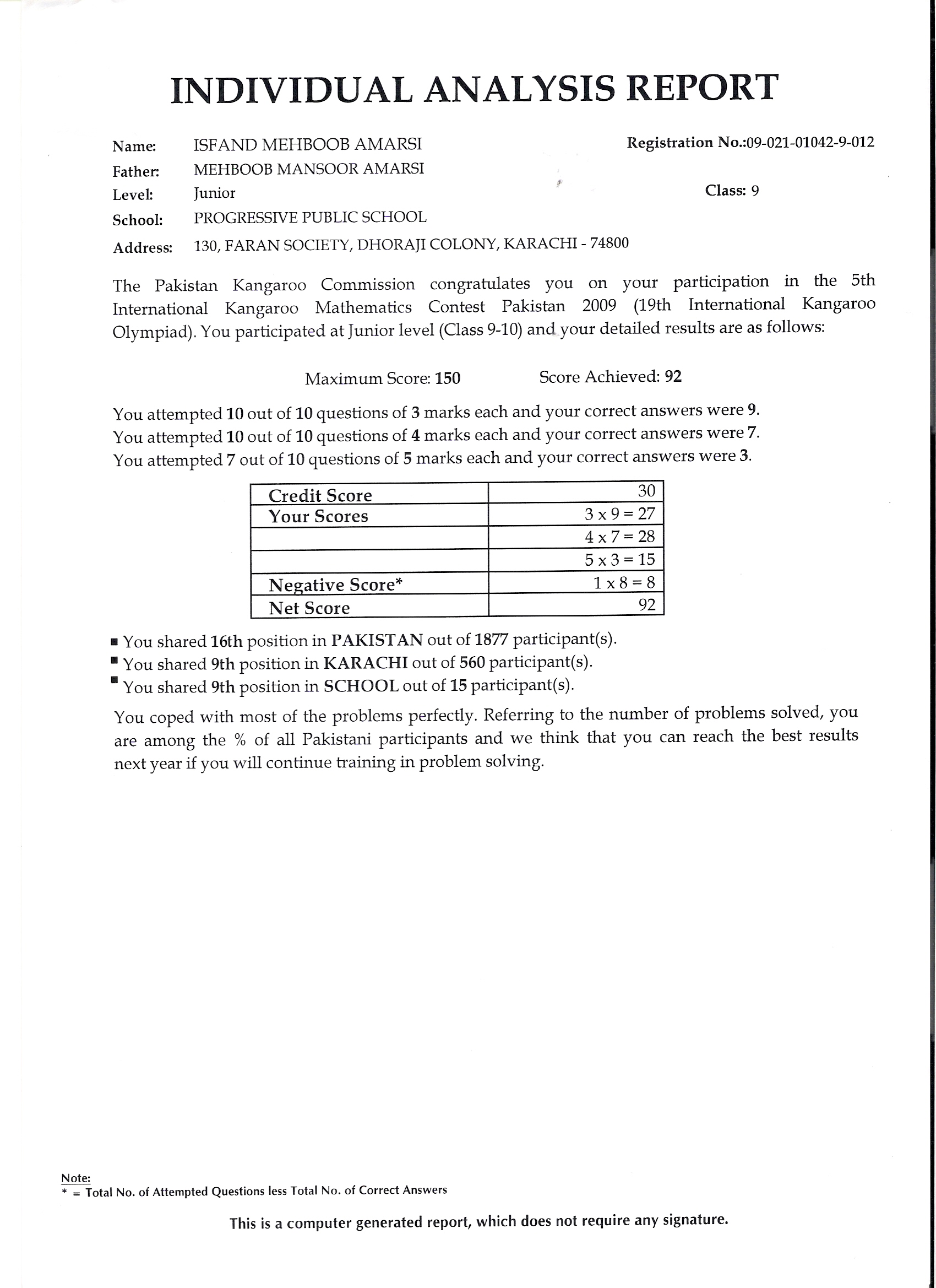 Isfand AmersiIsfand Mehboob Amersi of Class 9, Progressive School Karachi, scored 16th position in Pakistan out of 1877 participants.