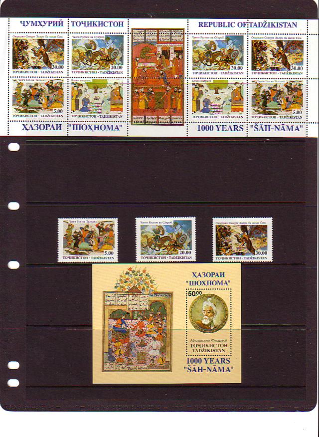 Copies of stamps, souvenir sheet and sheetlet issued by Tajik postal authorities in 1993 at the celebration of Shahnama of Firdawsi.