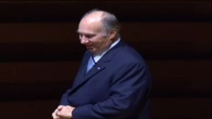 | Standing ovation for His Highness the Aga Khan as he finishes his speech | JRS: love your phrase ‘pluralism not a cause for anxiety but a source for delight.’ Aga Khan: U show it in Canada; that’s why the Centre is here. |