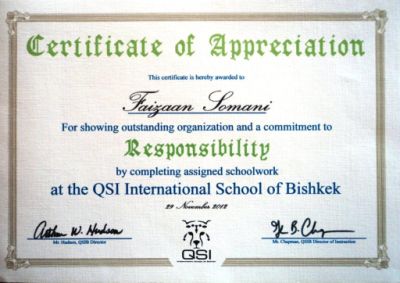 Faizaan Somani received “Certificate” for showing outstanding organization and commitment to “Responsibility” at the QSI International School of Bishkek.