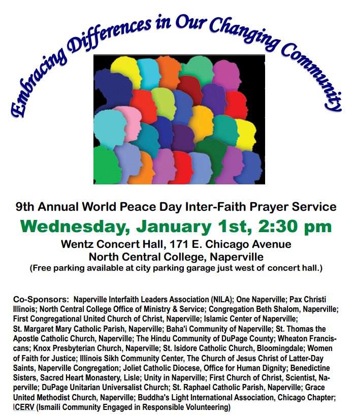via chicagotribune.com – The ninth annual World Peace Day Inter-faith Prayer Service will be held on Wednesday, January 1st, 2:30 pm at the North Central College Wentz Concert Hall, 171 E. Chicago Avenue in Naperville. The theme is year is “Embracing Differences in Our Changing Community.”