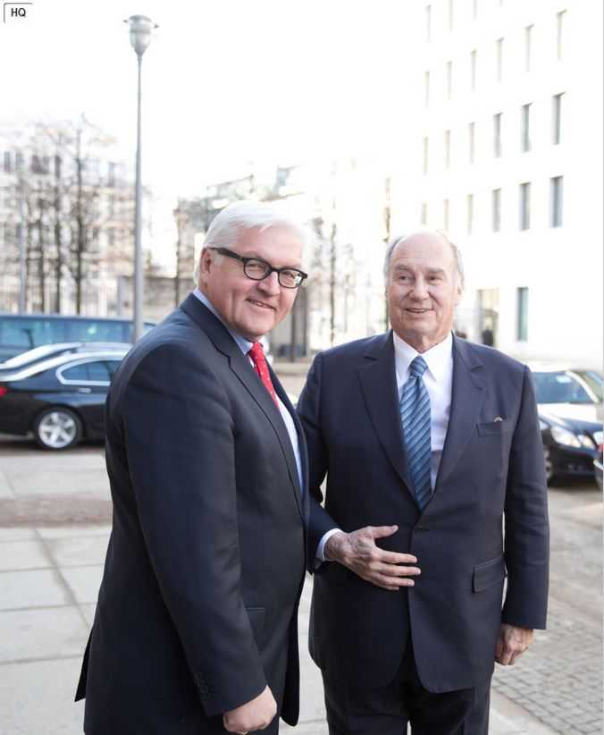 German Foreign Minister Frank-Walter Steinmeier (L) welcomes the Chairman of the Aga Khan Development network, Karim Aga Khan at the Foreign Ministry in Berlin, on February 5, 2014. AFP PHOTO / DPA/ JÖRG CARSTENSEN GERMANY Getty Images