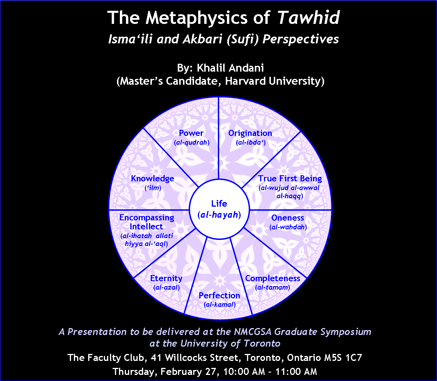 This is an invitation to Khalil Andani’s upcoming Conference Presentation in the NMCGSA Graduate Symposium taking place at the University of Toronto. The presentation will take place on Thursday, February 27, 2014 between 10:00 AM and 11:00 AM. It will be followed by some Q/A.