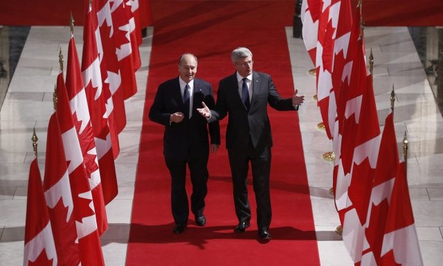 Canada’s Prime Minister Stephen Harper (R) walks with the Aga Khan, spiritual leader of Ismaili Muslims, in the Hall of Honour on Parliament Hill in Ottawa February 27, 2014. REUTERS/Chris Wattie (CANADA)