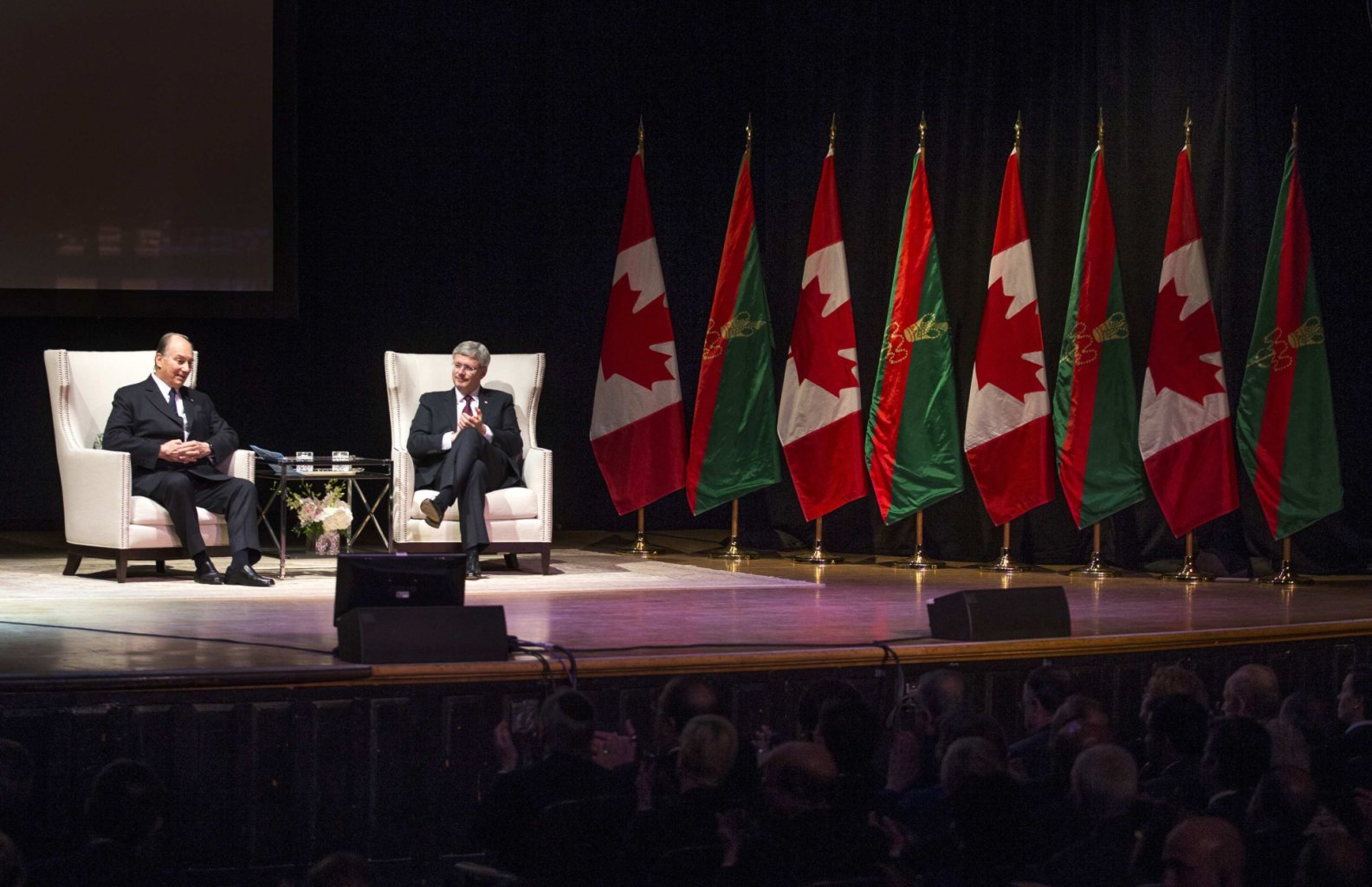 Canada’s Prime Minister Stephen Harper (R) sits with the Aga Khan, the spiritual leader of Ismaili Muslims, during a speaking event at Massey Hall in Toronto, February 28, 2014. REUTERS/Mark Blinch (CANADA)