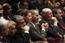 The Aga Khan ‘s son Prince Rahim, center, Brown class of 1996, with his wife Princess Salwa Aga Khan, to this left, listening to his father speak.