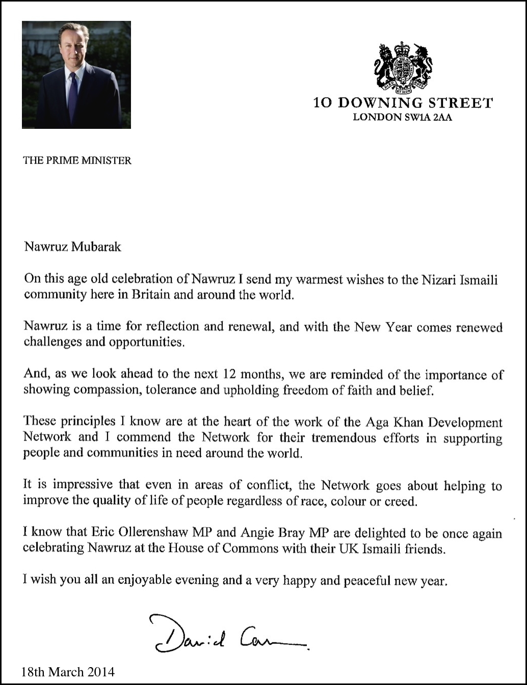Archive 2013: Prime Minister of the United Kingdom David Cameron sends Nawruz Greetings to the Ismaili Muslim Community