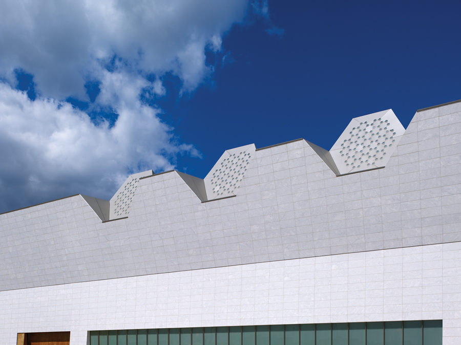 Honeycomb-shaped skylights are located above the main galleries in the Aga Khan Museum. The façade is made of white Brazilian granite and is detailed to produce crisp, clean-edged planes of light and shadow. Photo Tom Arban Source