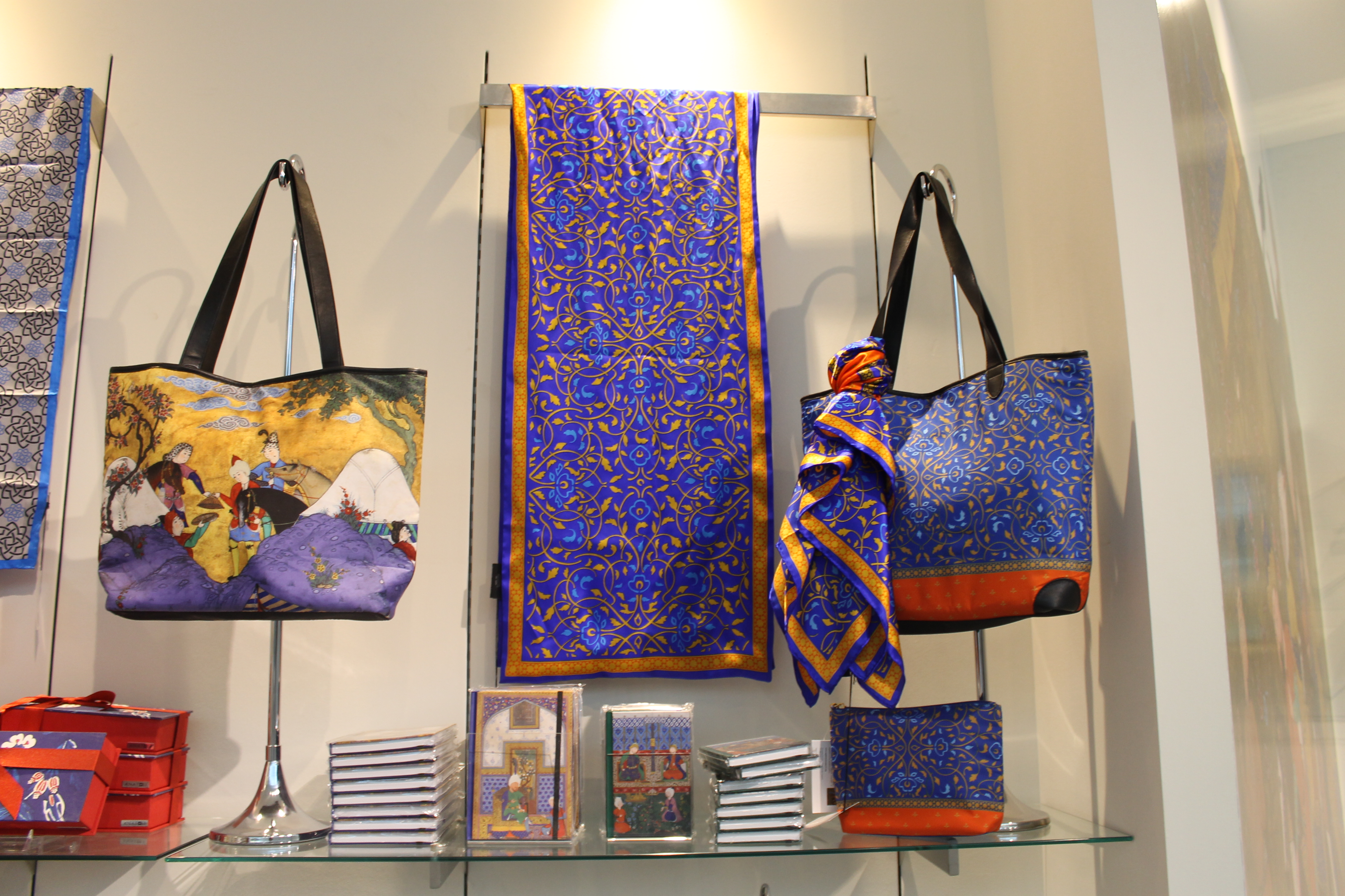 AKM Gift Shop – AKM proprietary products. September 11, 2014 Discovering Aga Khan Museum: The Gift Shop 4272 × 2848 Brightly colored arabesque patterns adorn scarfs and ladies bags. Brightly colored arabesque patterns adorn scarfs and ladies bags.