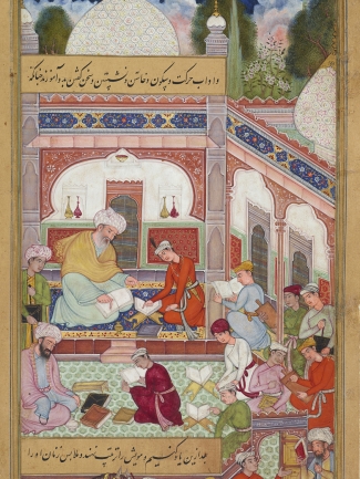 Nasir Ali-Din Tusi: School Courtyard With Boys Reading and Writing, Folio 49v of the Akhlaq-e Naseri (Ethics of Nasir), 1590-95, opaque watercolor, ink, and gold on paper, 9 1/2 by 5 1/2 inches; courtesy Aga Khan Museum, Toronto.