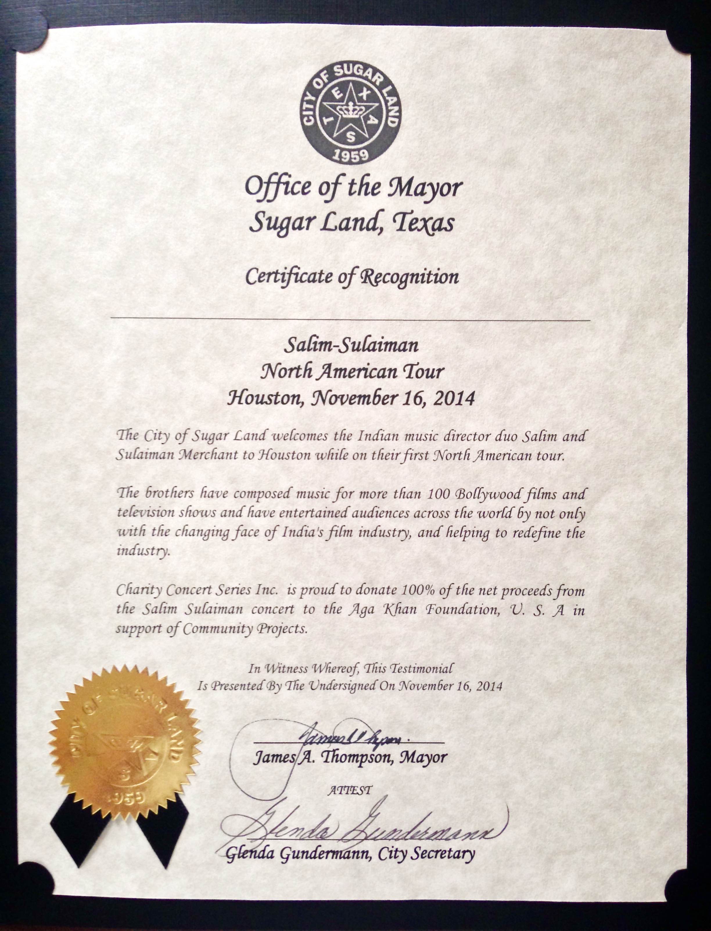 - Sugar Land Mayor honors Salim and Sulaiman with a Certificate of Recognition