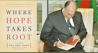 His Highness the Aga Khan seen signing his book “Where Hope Takes Root” for the Premier of British Columbia, The Honourable Gordon Campbell, during his Golden Jubilee visit to Vancouver in 2008. Photo Credit: The Vancouver Sun. Copyright. Via Simerg