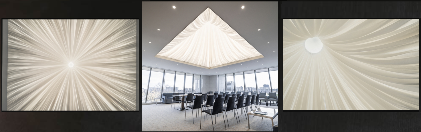 Eventscape also engineered, fabricated and installed the giant fabric funnel curtain. A beautiful translucent off-white fabric with an 500% gather was used to create this elegant focal feature. The 14 ft x 14 ft bottom rail and the top 12 inch diameter metal ring used custom adjustable mounting brackets to attach the fabric. Several prototypes were created prior to fabrication, to further define the ‘intangible’ elements of the design in collaboration with the architect, and to achieve the right combination of ‘loose and natural’ fabric drape while still maintaining the tight control of drape and gather required at the connection points.
