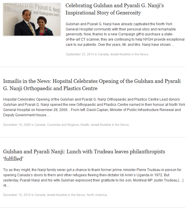 Pyarali, now the CEO of the GTA based Belle-Pak Packaging Inc. and his wife have made generous donations to hospitals in both Toronto and Montreal, including the Gulshan and Pyarali G. Nanji Orthopaedic and Plastics Centre and the Gulshan and Pyarali G. Nanji Ultrasound, CT and Radiography Centre at the North York General Hospital.