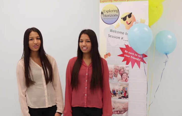Natasha and Alisha Nanji, twin sisters, started a nonprofit organization called Exploring Horizons, after witnessing senior neglect whilst volunteering at seniors’ homes. The organization hosts monthly sessions involving fun and mentally challenging activities and presentations to engage senior citizens and to bridge the inter-generational gap between seniors and youth. The organization has been featured on Rogers TV, invited to speak at Youth Philanthropy’s annual conference in Toronto, and featured in newspapers such as The Uxbridge Cosmos. In addition, Exploring Horizons was nominated for the 2014 Ontario Junior Citizen of the Year, and recently released a video titled Bridging the Age Gap, which can be viewed at https://www.youtube.com/watch?v=poPuMyhqjh4&feature=youtu.be.