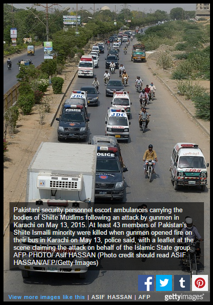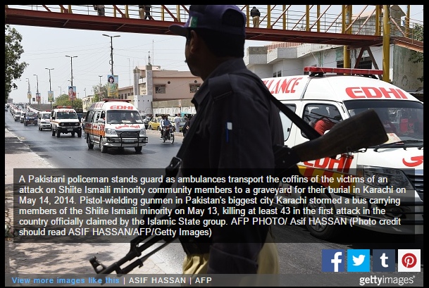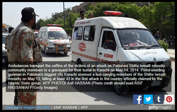 Pakistanis have taken to the streets in the southern city of Karachi for a mass funeral procession of dozens of Ismaili Shia Muslims killed in a terrorist attack.