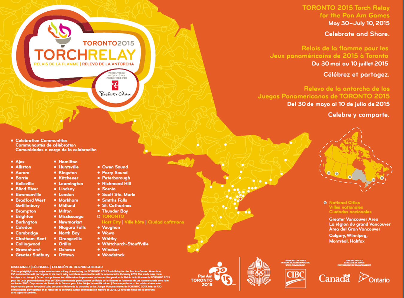 The torch relay will start in Canada on May 30, 2015, and will make its final stop on July 10, 2015, at the Opening Ceremony of the TORONTO 2015 Pan Am Games.