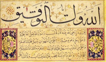 Calligraphy, from the Greek kallos (beauty) and graphein (to write) is the art of beautiful writing. Although the development of sophisticated calligraphy as an art form is not unique to Islamic culture, it has been used to a much greater extent and in varied ways, and in all art forms and materials in Islamic cultures.