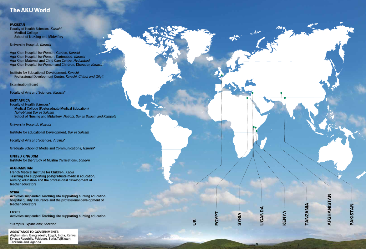 The Aga Khan University (AKU) is the only university in the developing world with eleven campuses spread across eight countries and three continents. It also has a network of nine libraries, although small in size, in four developing countries in two regions (South Asia and East Africa).