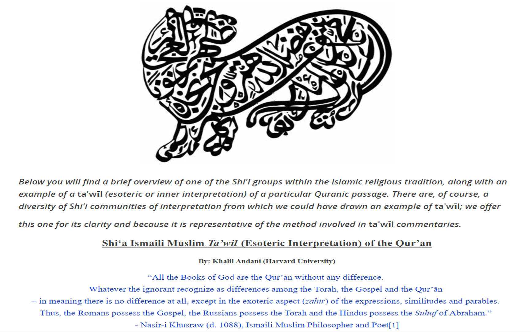- Ismaili Muslim spiritual interpretation (ta’wil) of the Qur’an, focused on the inner meaning of the “Six Days of Creation”