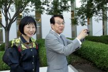 Japanese Ambassador Kenjiro Monji, right, takes a photo while on a tour of the Delegation of the Ismaili Imamat building with his spouse, Etsuko Monji, at the July 7 celebration of the anniversary of the appointment of the Aga Khan, the spiritual leader of Ismaili Muslims. (Image credit: The Hill Times / Sam Garcia)