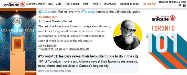 Air Canada’s enRoute flight magazine introduces Toronto’s ultimate city guide featuring Aga Khan Museum as one of the favorite places to visit as revealed by 101 of Toronto’s movers & shakers …