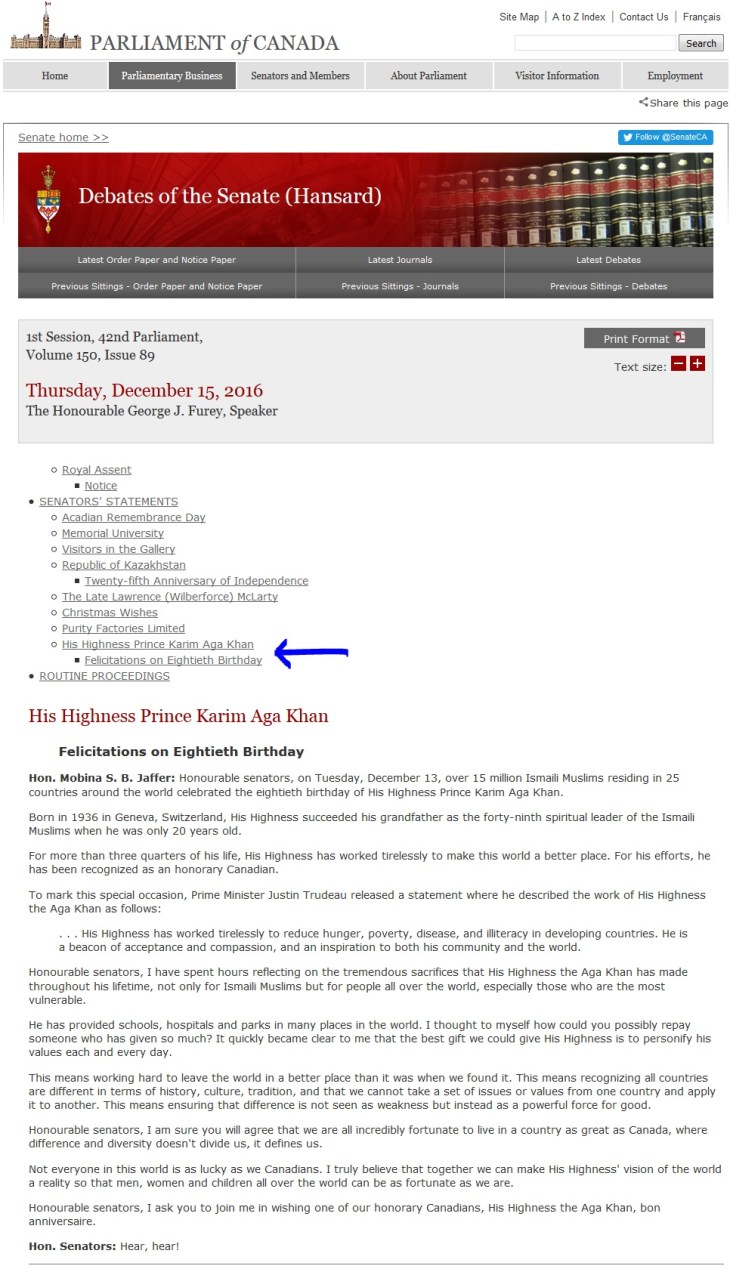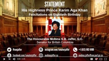 On December 15th, 2016, Senator Mobina Jaffer, Liberal Senator for British Columbia rose in the Parliament of Canada, during the Debates of the Senate to wish felicitations to His Highness Prince Karim Aga Khan on his 80th birthday.