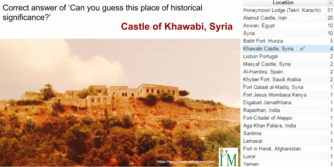 We received an overwhelming response on this challenging visual quiz question. More than 180 of our readers responded, locating this image to several known and similar-looking castles and forts of the world. However, majority of the participants thought that this is the birthplace of the 48th Ismaili Imam Sir Sultan Muhammad Shah Aga Khan III, in Karachi (also known as “Honeymoon Lodge”, or “Tekri”), which is incorrect. The correct answer is: the Castle of Khawabi in Syria.