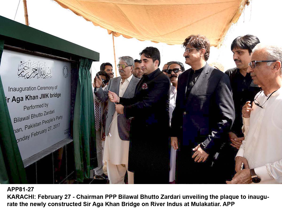 app81-27karachi February 27, 2017 Government of Sindh (Pakistan) inaugurates Sir Aga Khan Bridge at Jhirk 1200 × 901 APP81-27 KARACHI: February 27 – Chairman PPP Bilawal Bhutto Zardari unveiling the plaque to inaugurate the newly constructed Sir Aga Khan Bridge on River Indus at Mulakatiar. APP