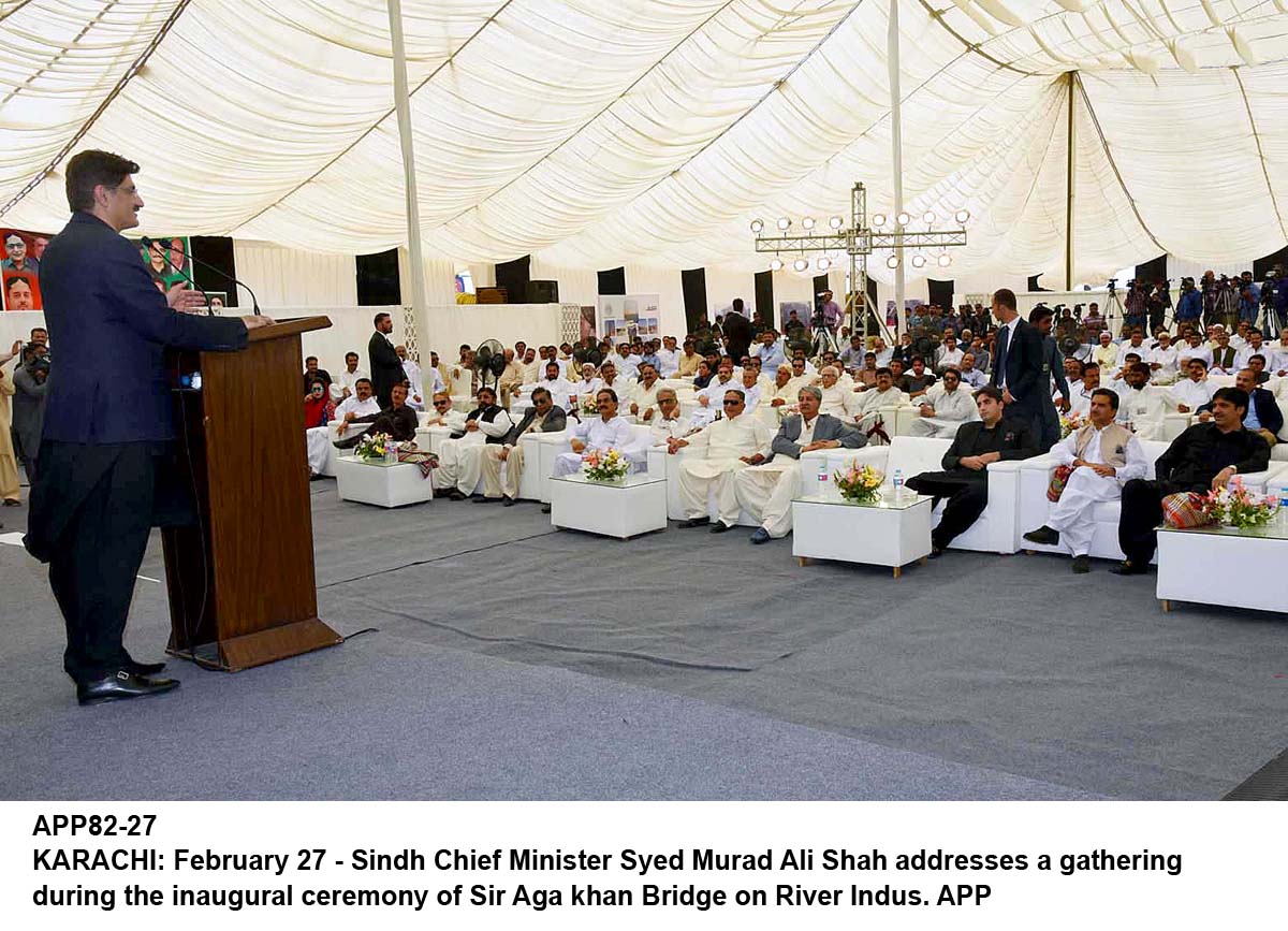 app82-27karachi February 27, 2017 Government of Sindh (Pakistan) inaugurates Sir Aga Khan Bridge at Jhirk 1200 × 867 APP82-27 KARACHI: February 27 – Sindh Chief Minister Syed Murad Ali Shah addresses a gathering during the inaugural ceremony of Sir Aga khan Bridge on River Indus. APP