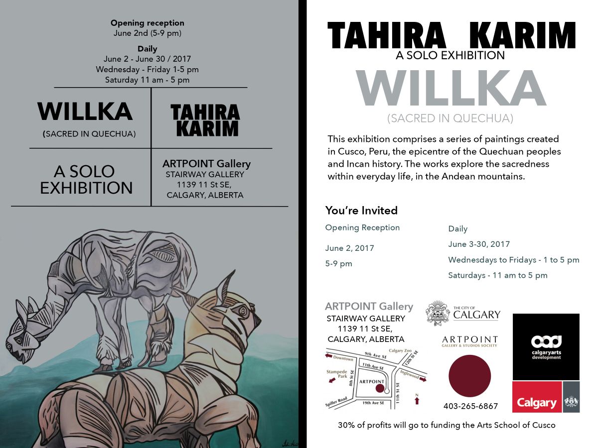 Calgary, Alberta, June 2, 2017 to June 30 2017 – Tahira Karim with support of the Artpoint Gallery presents “Willka – Sacred in Quechua” an exhibition featuring both oil paintings and illustrations exploring and depicting life and sacredness in the Sacred Valley of Peru.