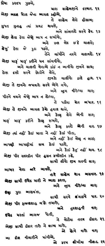 | Eji Pir Sadardin, Pir Hasan Kabirdin kahe Sami liyo jiv gatni saar aakhar vela jaare aavshe taare Saheb thaaye asvaar.. ..19 |