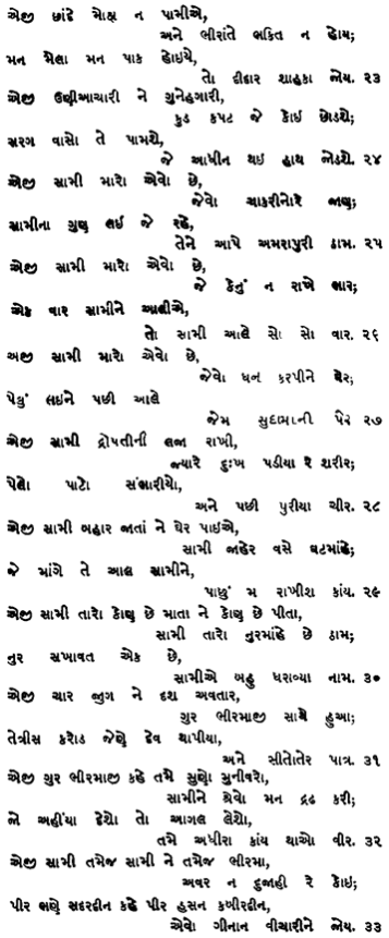 | Eji Sami tamej Sami ne tame-j Bhirma avar na dujaahi re koi Pir bhañe Sadardin kahe Pir Hasan Kabirdin evo ginan vichaari ne joy.. ..33 |