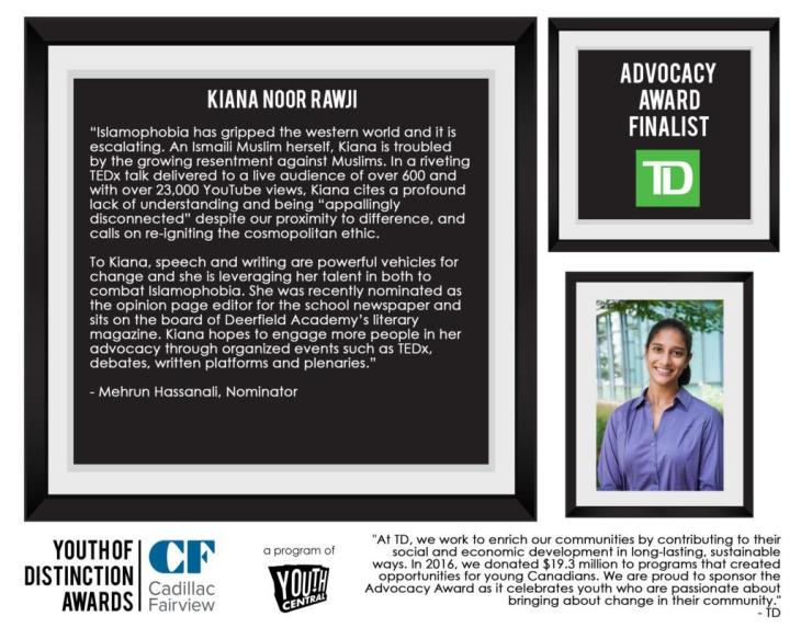 Kiana, a 16-year-old Calgarian indeed strives to be the cosmopolite she is urging others to be. She attended 8 years at Strathcona-Tweedsmuir School in Calgary before she left to study high school at Deerfield Academy, a highly competitive, boarding school in Massachusetts where she is a Grade 10 student. Kiana is a strong public speaker and was selected for the Canadian National Speech Competition in 2014 when she was in Grade 8. Merely 13 she chose as her gold medal winning speech topic the controversial bill then being tabled in Quebec that in essence was aimed at Muslim women who wore the niqab. She stated, “as a strong believer in social justice, as well as an Ismaili who does not wear the niqab herself but respects the values and beliefs of other Muslims, I felt that it would be wrong for a province to deny their citizens from expressing their religious and cultural identities, especially in Canada, a nation known to embrace diversity.”