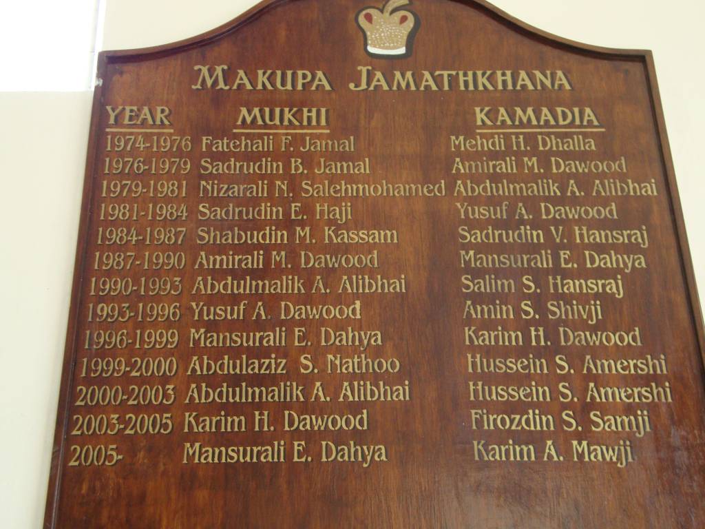 Makupa Jamatkhana Mombasa Entrance to the Jamatkhana with tusksMakupa Jamatkhana MombasaMakupa Jamatkhana Mombasa Decorative Fountain outside the JamatkhanaMakupa Jamatkhana Mombasa Outside the main entrance of the JamatkhanaList of Mukhi-Kamadia Sahebs from 1952 to 1974 Makupa Jamatkhana MombasaList of Mukhi-Kamadia Sahebs from 1975 to 2005 Makupa Jamatkhana Mombasa