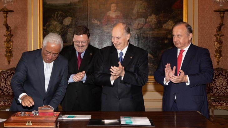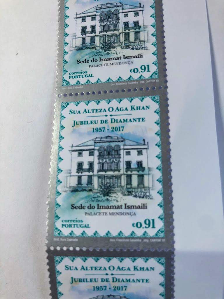 Prime Minister António Costa unveils the official Diamond Jubilee commemorative postage stamp in the presence of Mawlana Hazar Imam, as Francisco Lacerda, CEO of CTT (Portugal Postal Services), and Raul Moreira, Head of Philately for CTT, look on. Photo: The.Ismaili / Nazim Lokhandwala